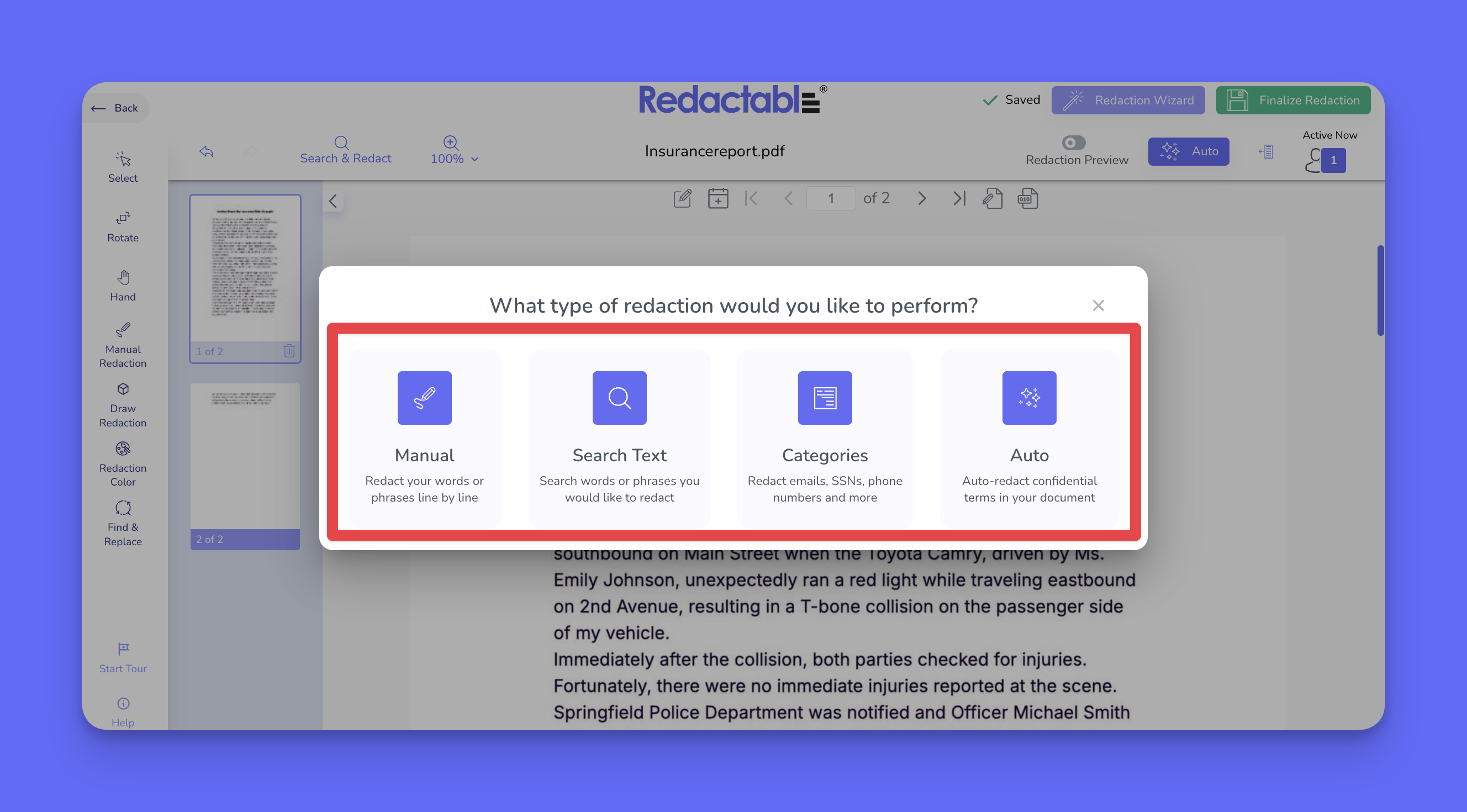 5. Use the Redaction Wizard to manually redact content, search text, apply categories, or use the Auto option to scan your document for confidential terms.