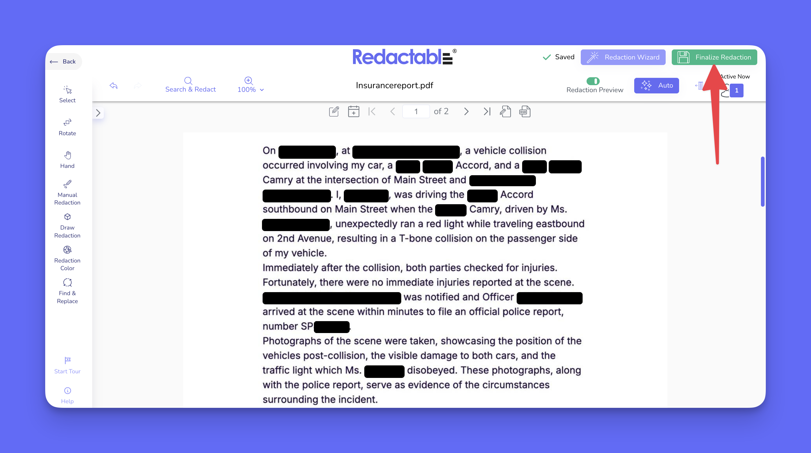6. Click "Finalize Redaction" on the top right corner when you are finished redacting your document.