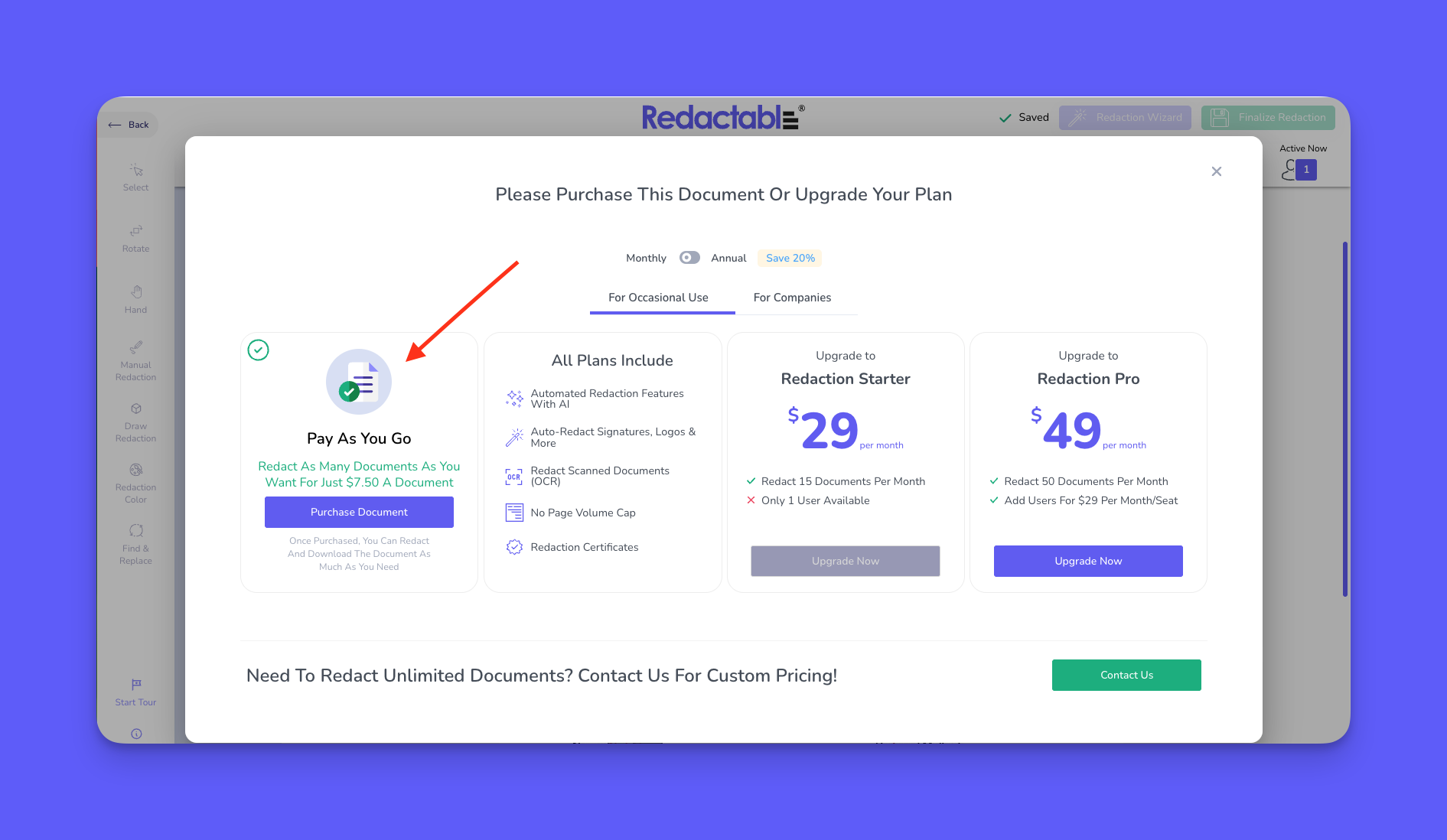 The Pay-As-You-Go option is intended for occasional document redaction. After the three free documents are used, additional documents can be redacted for $7.50 each.