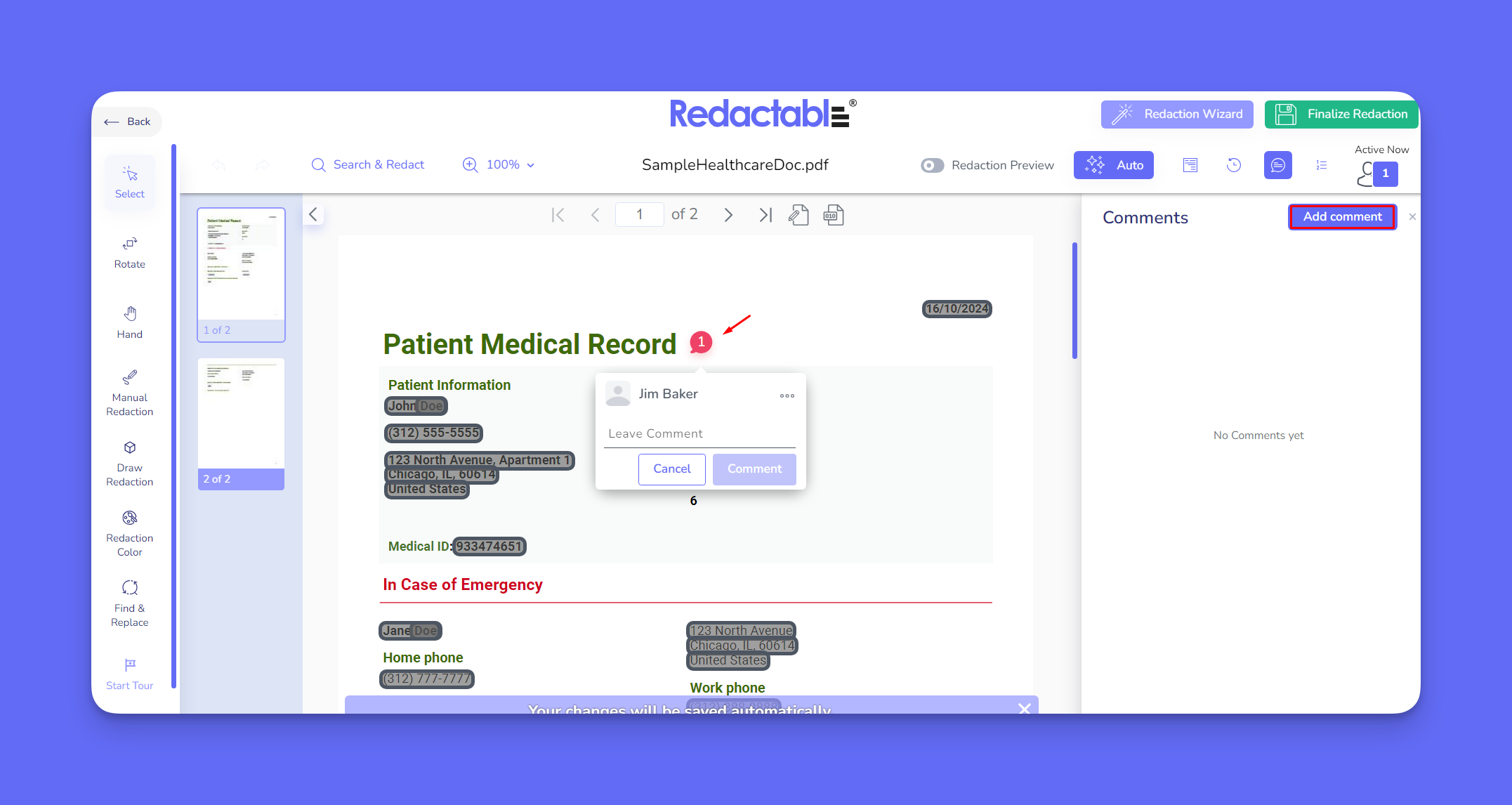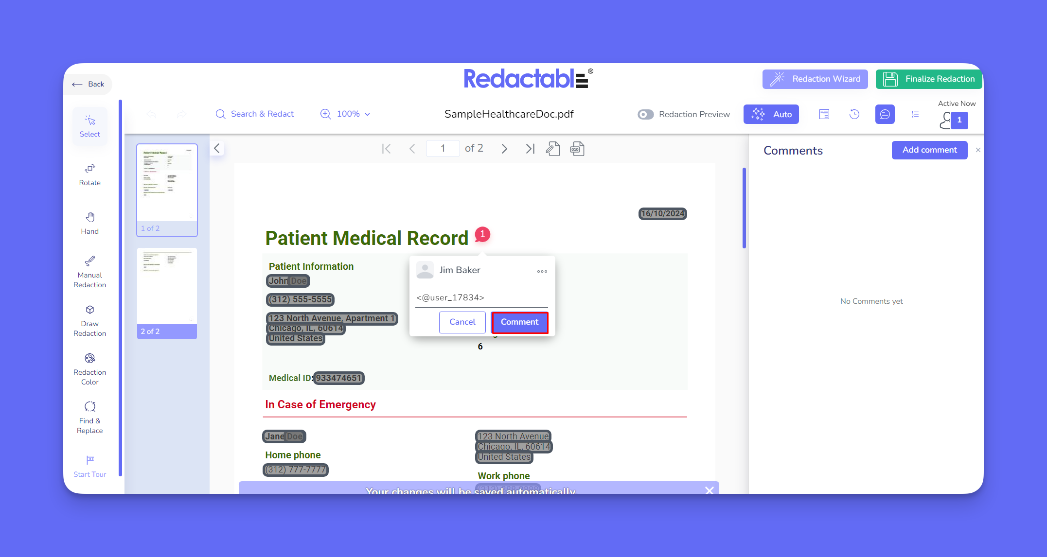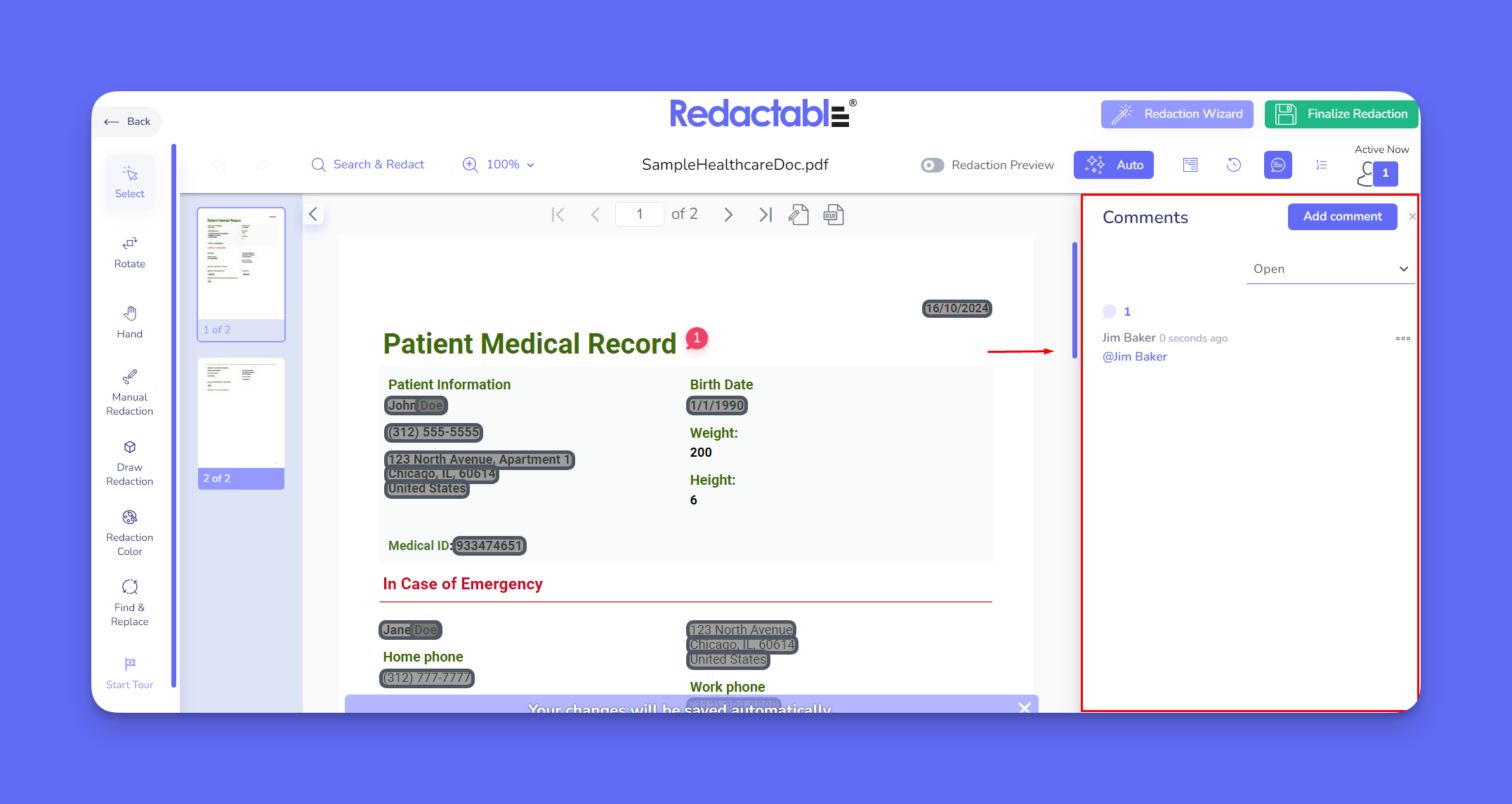 Redactable’s Comments feature is designed to improve collaboration. It allows users to leave precise feedback directly in a document. This feature helps teams streamline communication, ensuring feedback is captured clearly and acted upon promptly.