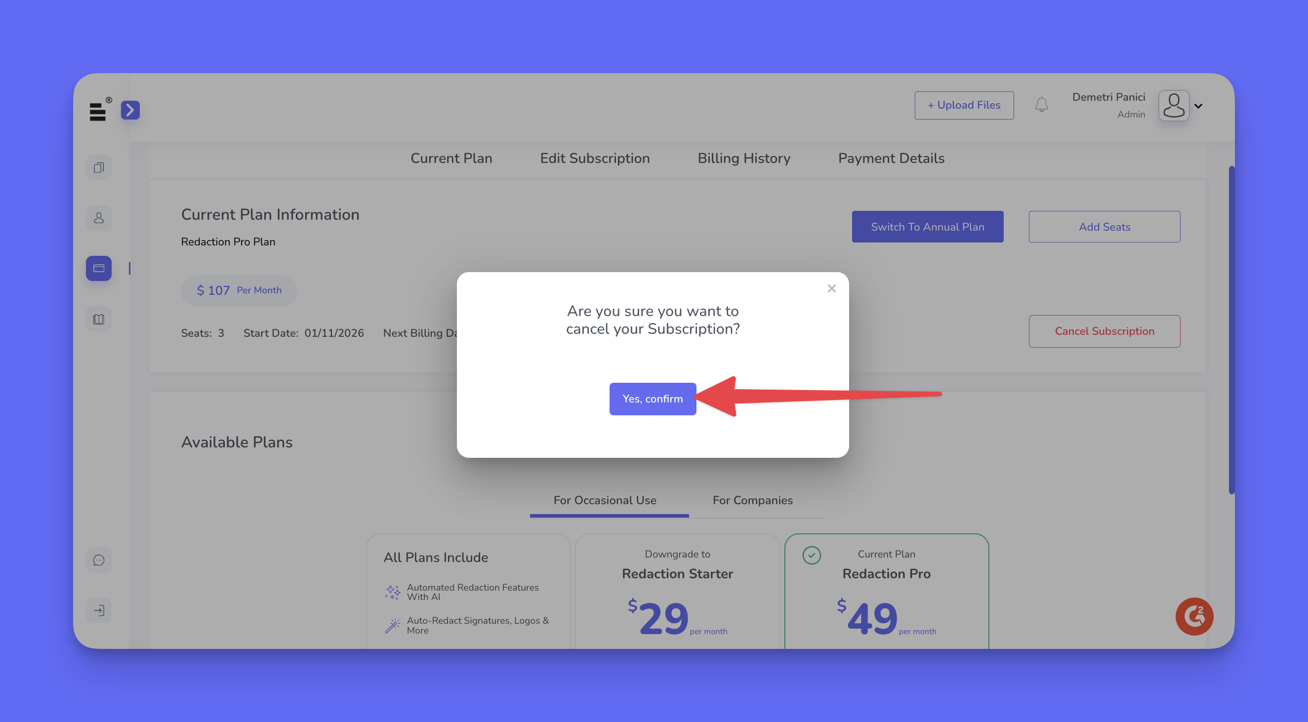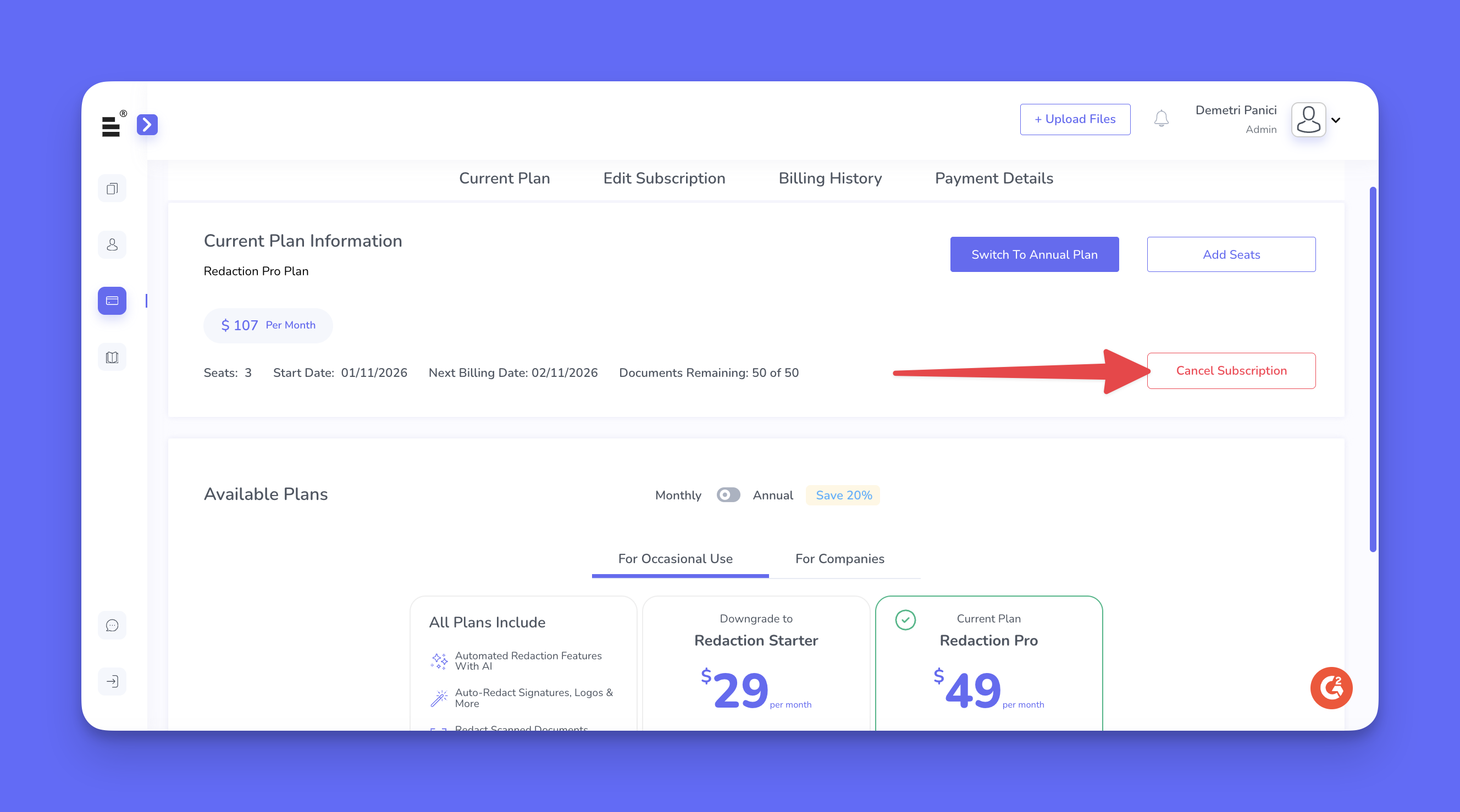 Redactable’s Cancel Your Subscription feature allows account owners to cancel or manage their Redactable subscription directly from their account. The cancellation process is transparent and does not require plan downgrades or restrict account access during the billing period.
