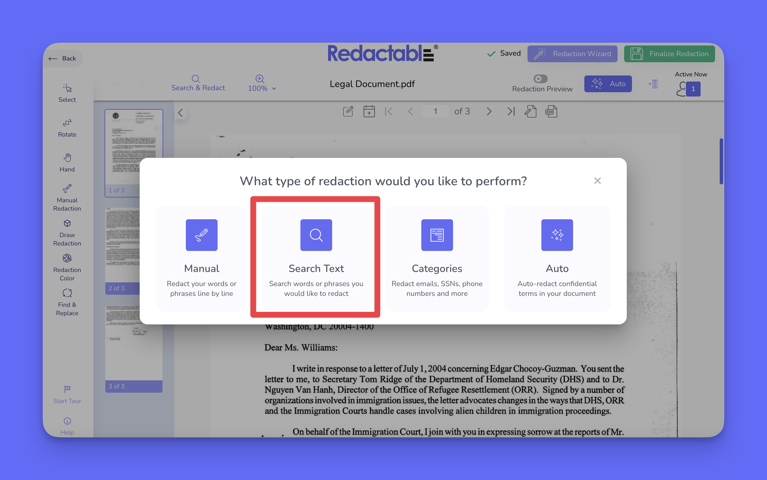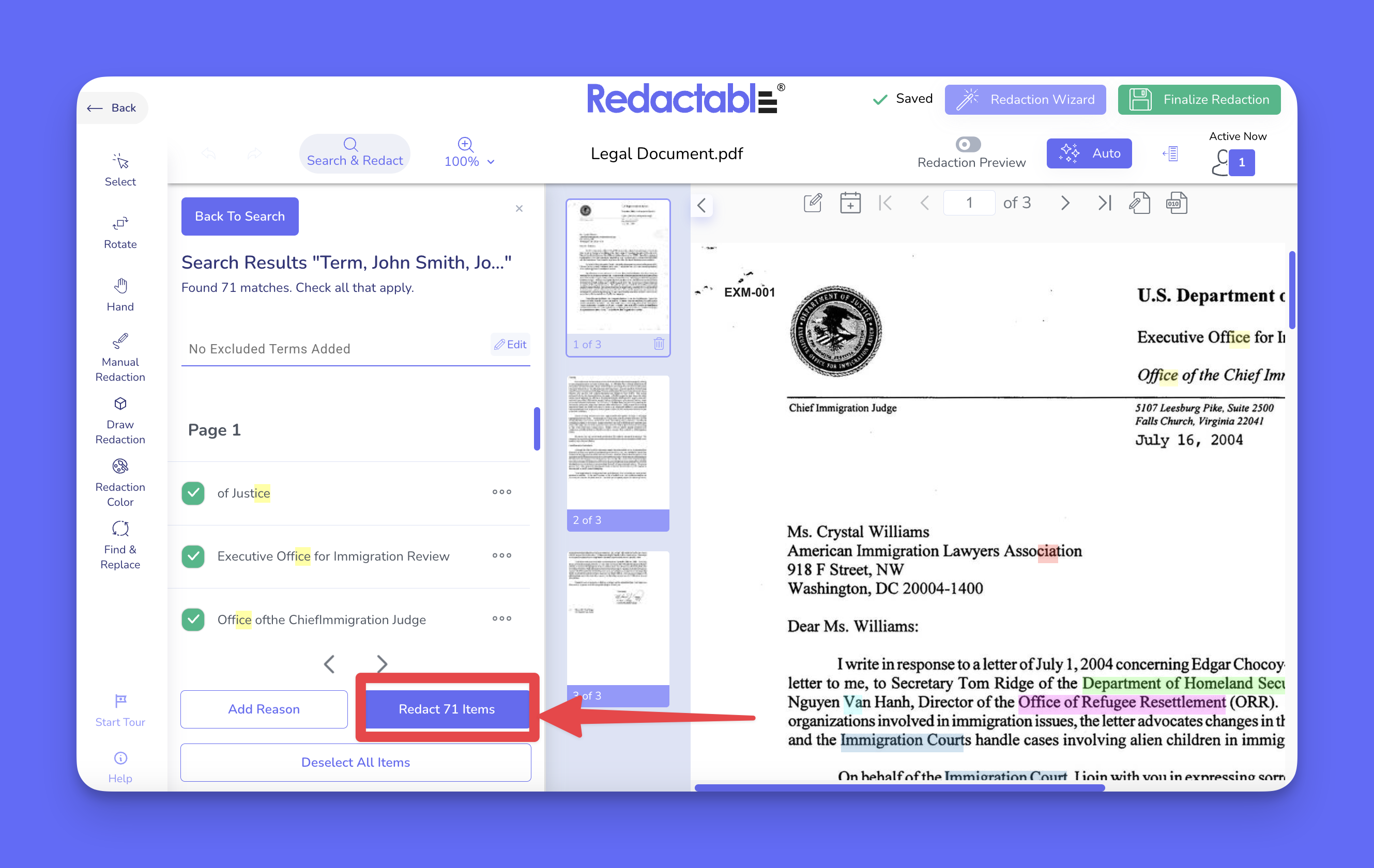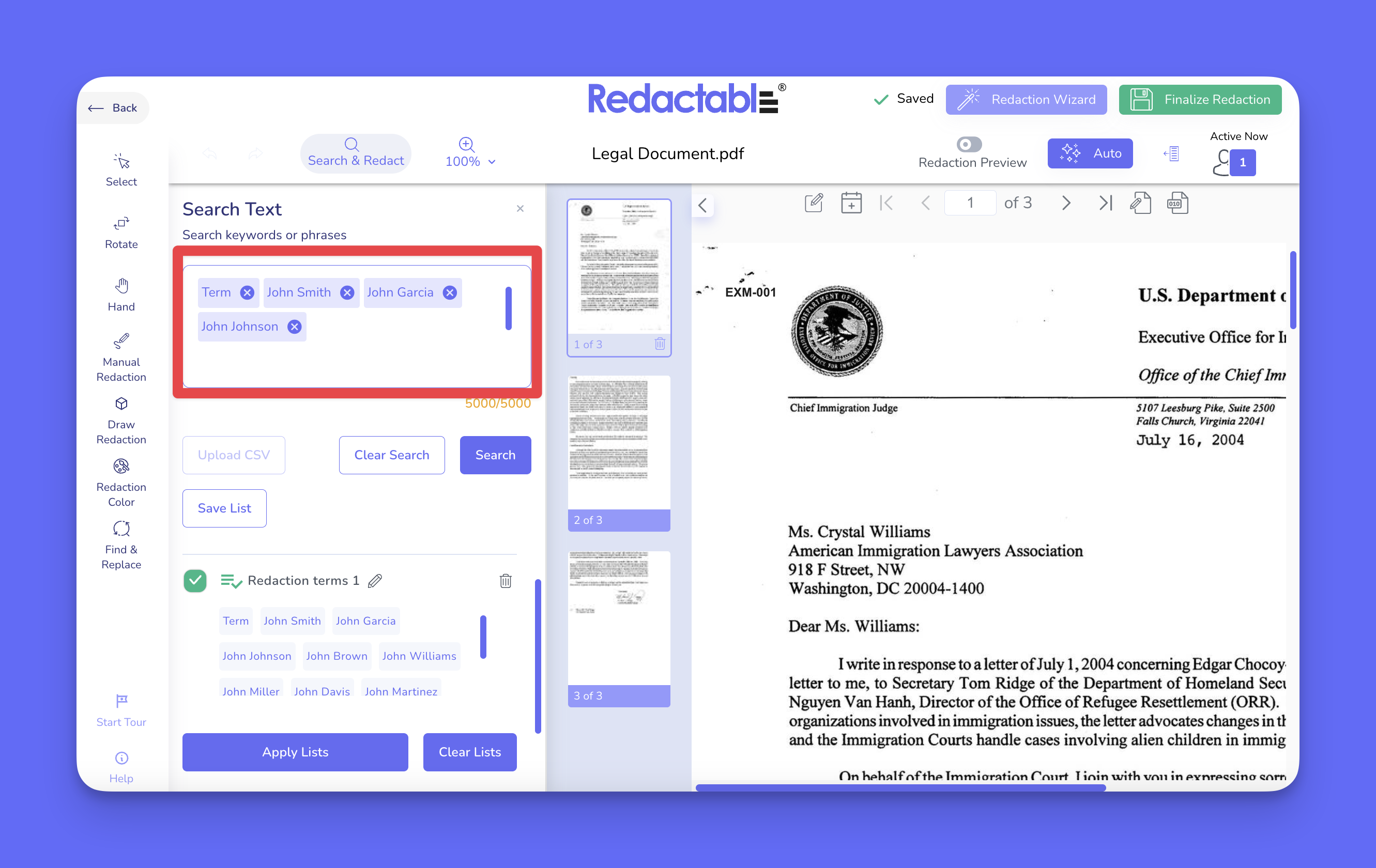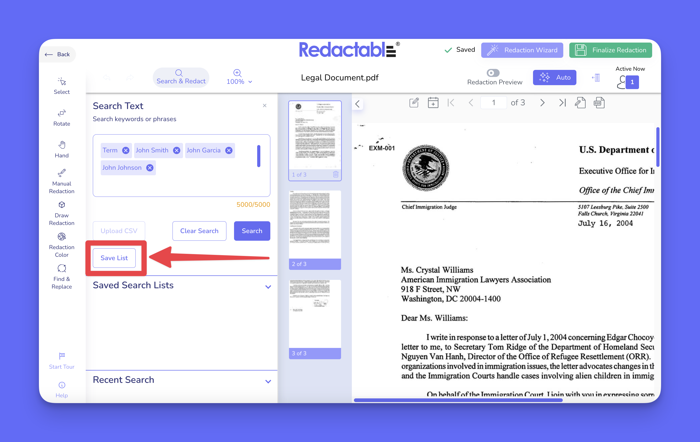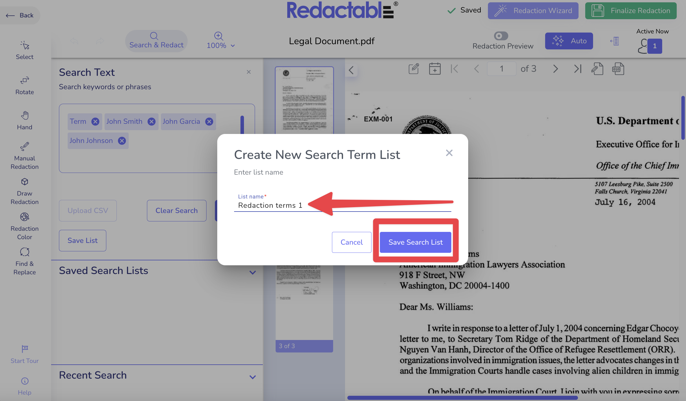 This reduces manual effort, particularly for workflows involving recurring redaction projects, regulatory term lists, litigation keyword sets, or government exemption terms.