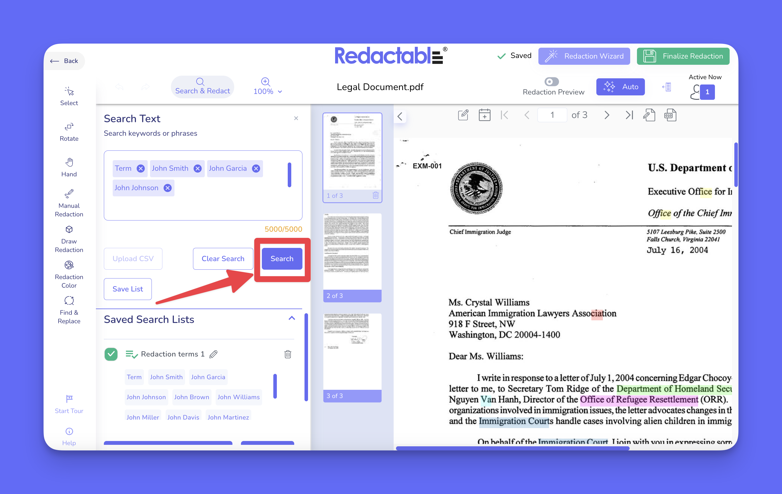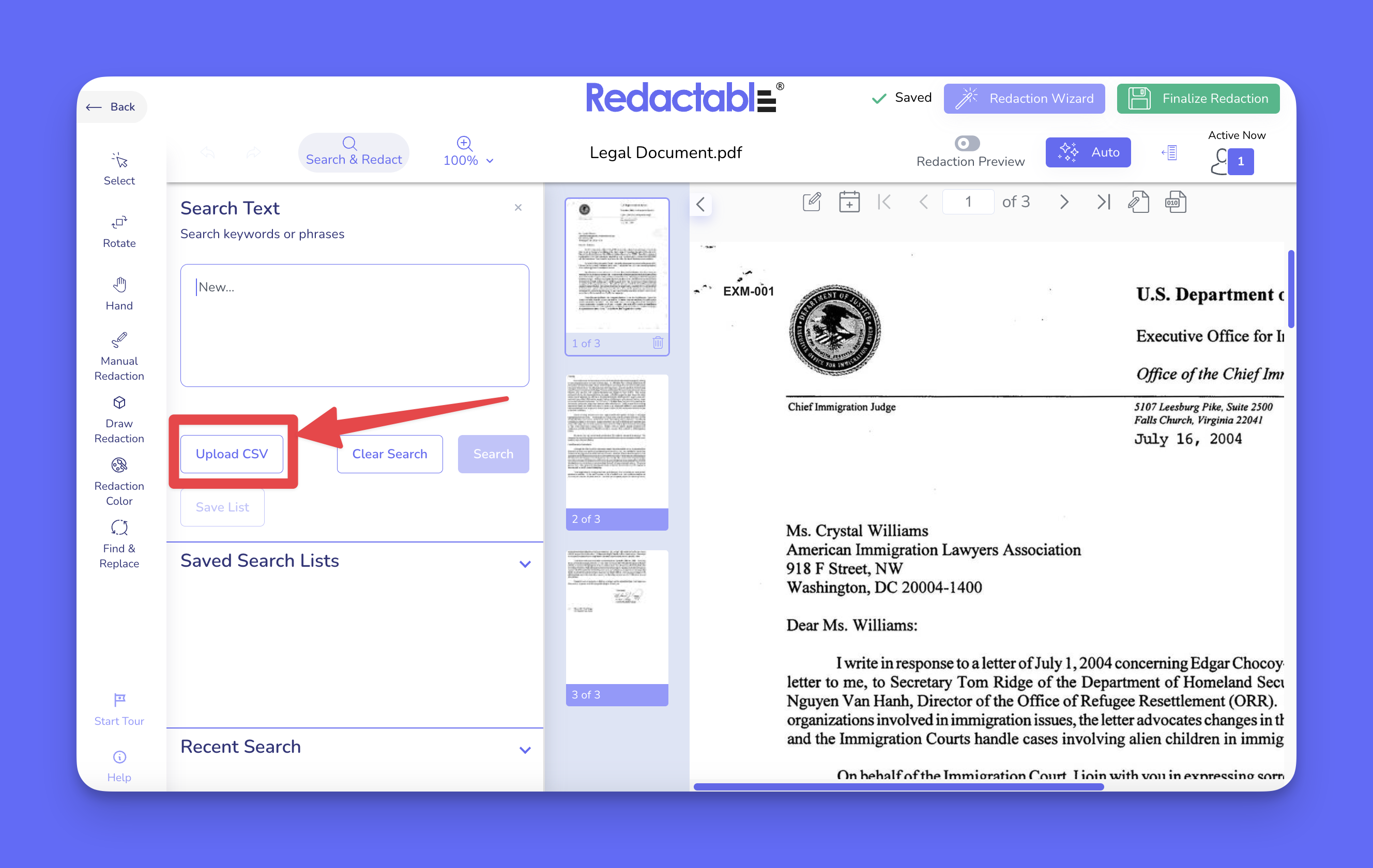 Uploading a CSV file of terms within the Search & Redact and Search Exclusion workflows in Redactable allows you to populate your active search or exclusion list with up to 5,000 keywords or phrases at once. Rather than manually entering each term, you can upload a properly formatted CSV file to configure your criteria efficiently and support consistent, scalable document review.