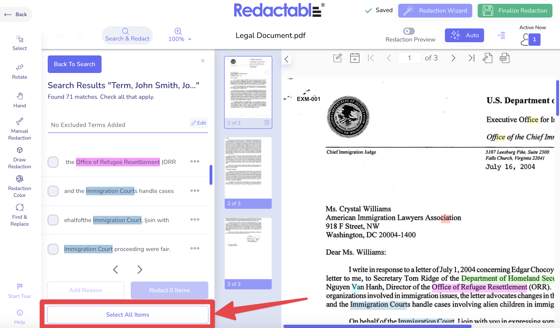 7. To run the redaction using uploaded terms confirm the imported terms appear correctly